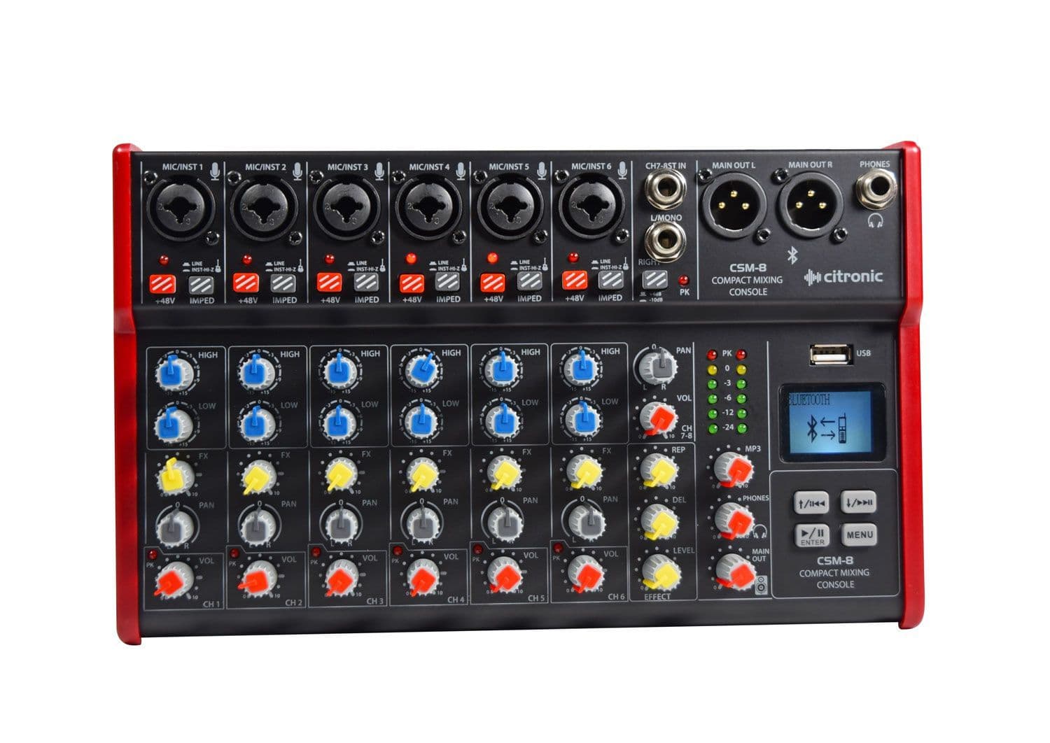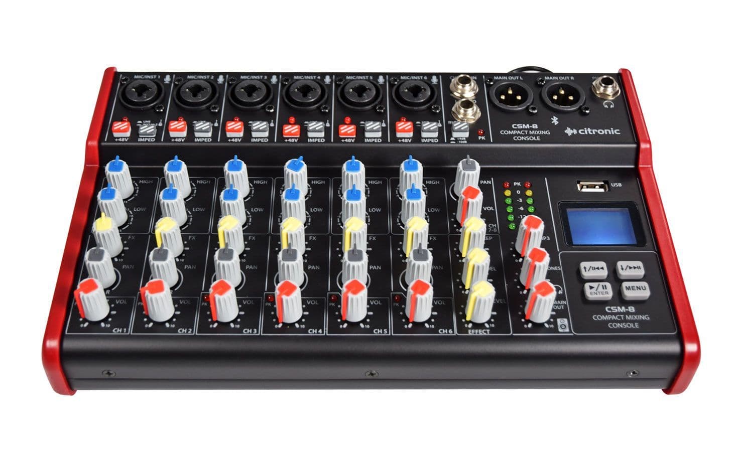 Compact format audio mixer with 2, 4 or 6 mono input channels and a stereo line input. Each mono channel has a combo XLR/jack input with individually switchable mic/instrument impedance and +48V phantom power for the XLR. Input channels have High/Low EQ and Pan controls and mono channels also have Effects level to vary the amount of internal digital delay effect added for vocals or instruments. An internal player/recorder with backlit display can accept a USB memory stick containing compressed audio files in various formats or alternatively connect to a smart phone via BT wireless link. Output is delivered on a pair of balanced XLR connectors and offers very low noise operation for high quality studio or live performances.