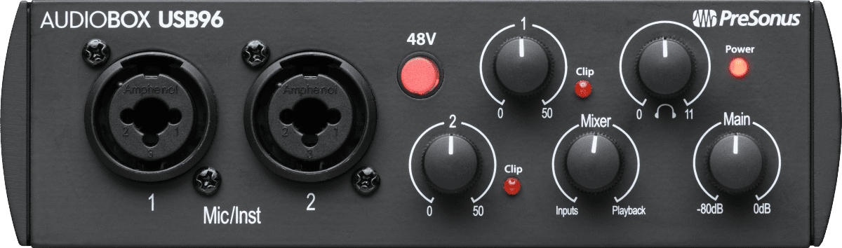 Two front-panel combo mic/instrument inputs, two balanced line-level outputs, an ultra-loud headphone out, and MIDI I/O make the AudioBox USB 96 an affordable stereo-recording solution for singer/songwriters, podcasters, guitar or guitar-bass collaborations and more. A Mix control lets you balance the level between the input signal and computer playback without any latency.
