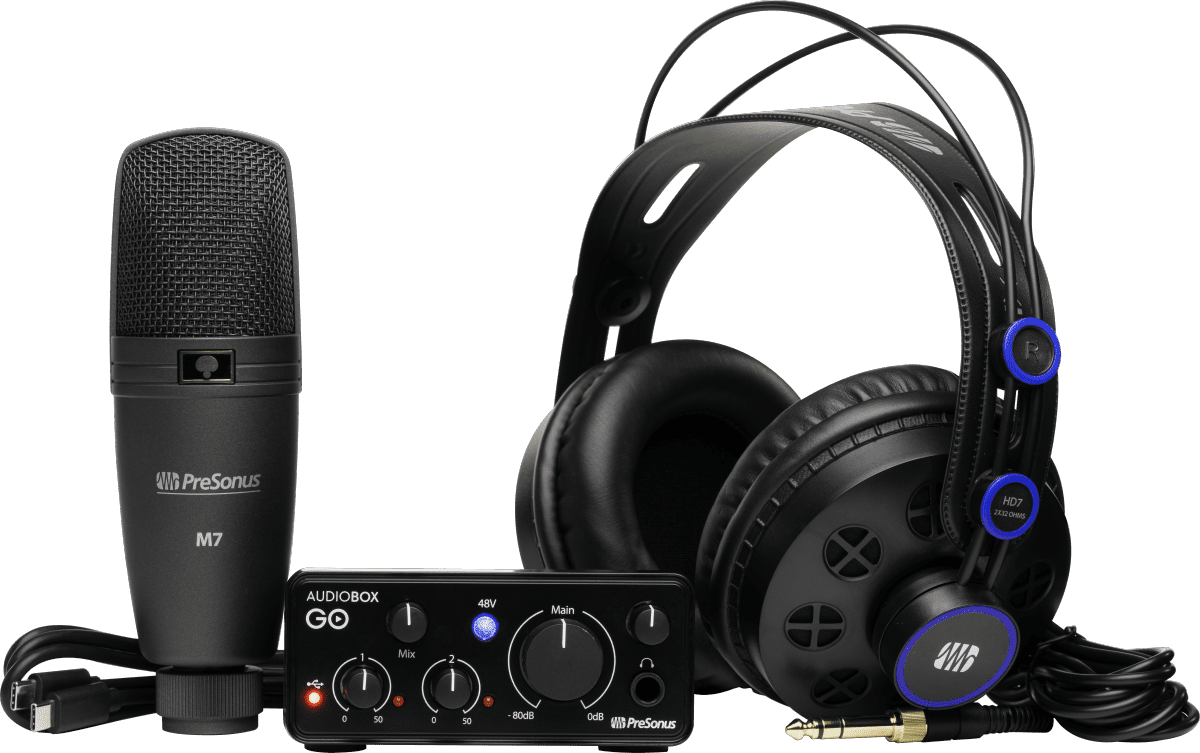 The PreSonus AudioBox GO Creator Bundle is your ultra-affordable one stop shop for creating studio-quality recordings. Featuring the ultra-compact and surprisingly powerful 2x2/24 bit / 96 kHz AudioBox GO USB Recording Audio interface, Studio One Pro 7 recording software access with 6 months of Studio One Pro+, a pair of ergonomic high-definition HD7 headphones, and a versatile M7 cardioid condenser microphone with mic stand adapter and 10-foot XLR cable, the PreSonus AudioBox GO Creator Bundle gives you everything you need to create like a pro, so you can get started recording right away.