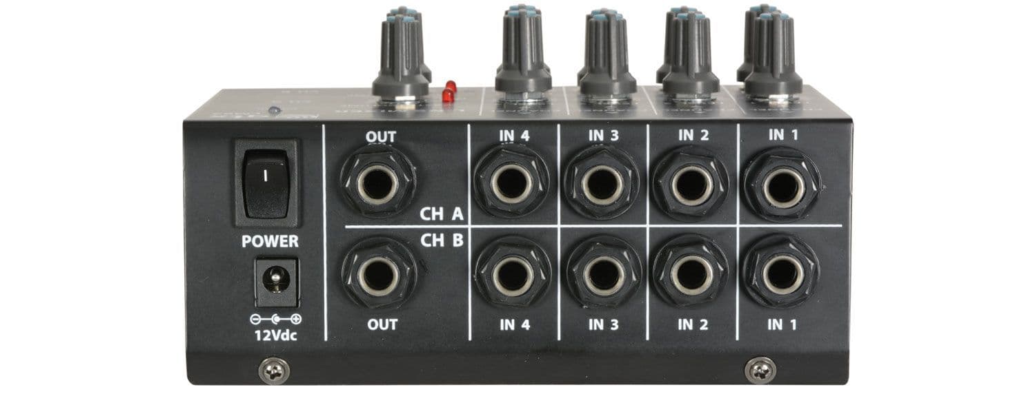 Compact mixer with high impedance jack inputs suitable for auxiliary line level or instruments, mixing to a master jack output. Available as a 4 stereo version with separate volume controls for each input and master output. Powered by 1 x 9V battery or optional 12Vdc adaptor